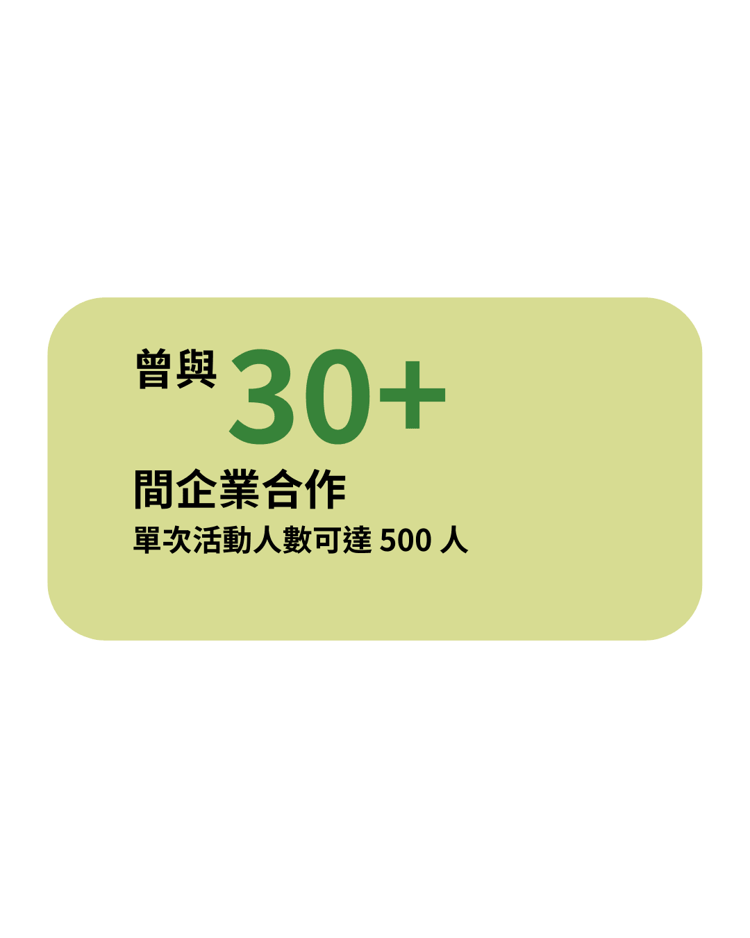 企業可透過輕鬆、創新的自然體驗活動,建立健康、富有凝聚力的團隊,啟發團隊創造力、提升集中力及環保意識,符合企業SDG 要求及 ESG 中的 Social 社區參與方向。活動收益可同時資助低收入家庭學生參加自然體驗活動。